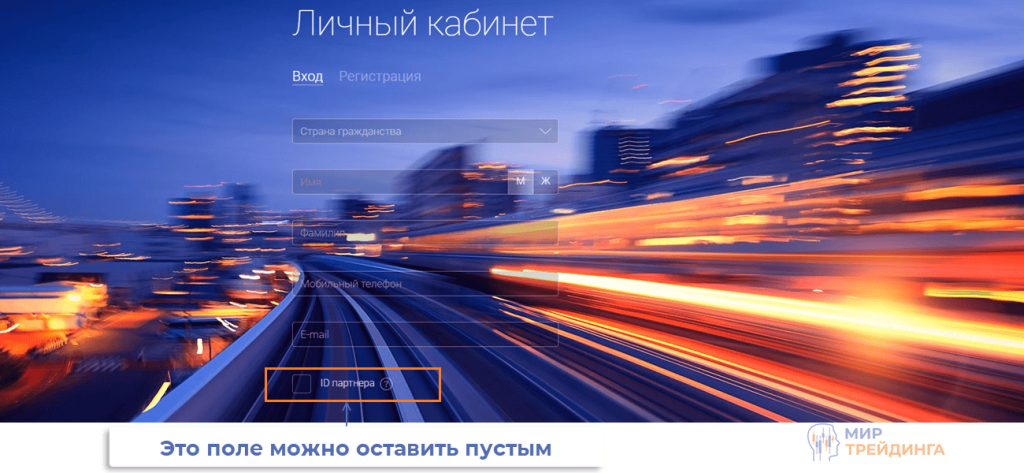 в открывшейся форме выберите пункт «Регистрация», появится стандартный набор полей. Заполните их, подтвердите согласие, что брокер будет периодически связываться с клиентом в маркетинговых целях. Поле «ID партнера» можно оставить пустым. Оно предназначено для реферального кода. Заполняется только при условии, что вы узнали о компании от кого-то другого и хотите стать его рефералом. На вашем счете и торговых условиях это никак не скажется;