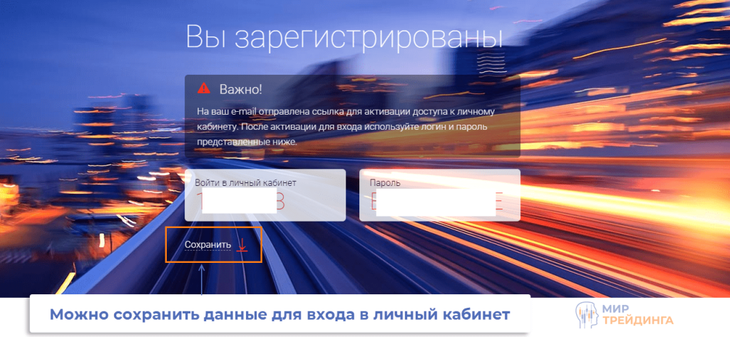 на следующем этапе брокер выдает логин и пароль от личного кабинета. Прямо с этой страницы можно сохранить эти данные на ПК в виде html-страницы. Также на почту приходит письмо со ссылкой для верификации e-mail, перейдите по ней. Помимо верификационной ссылки в этом письме дублируется логин и пароль от личного кабинета;