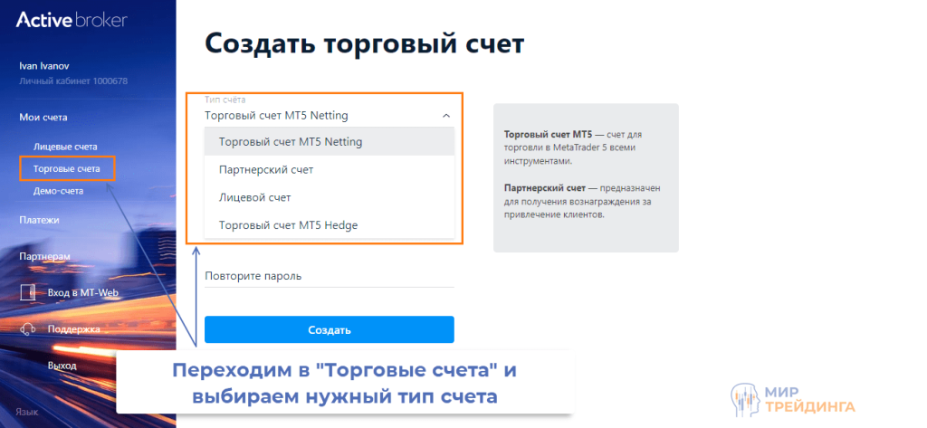 для регистрации торгового счета выберите соответствующий пункт в разделе «Мои счета». На выбор дается 4 типа счетов, для торговли нужен либо MT5 Netting, либо MT5 Hedge. Также создается пароль для отдачи приказов по телефону.