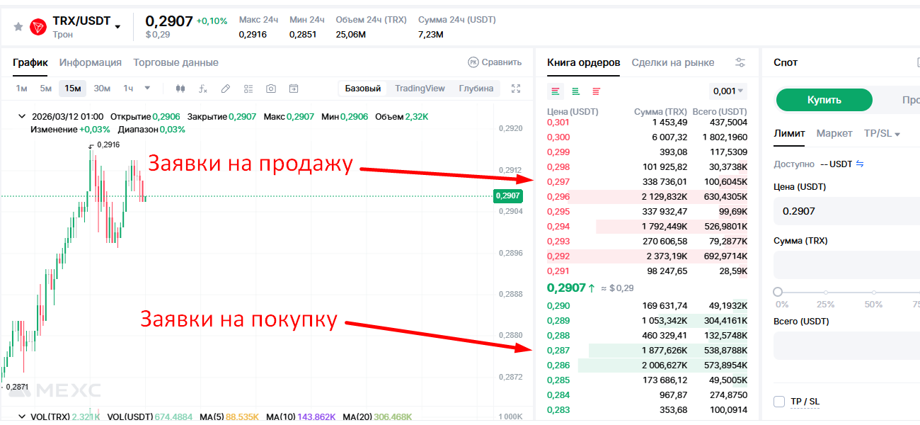 Все заявки, которые отображаются в стакане заявок на бирже, относятся к категории лимитных ордеров. Лимитный ордер размещается заранее и исполняется только тогда, когда рынок достигает указанной цены. Такие ордера формируют структуру книги заявок и показывают намерения участников рынка.