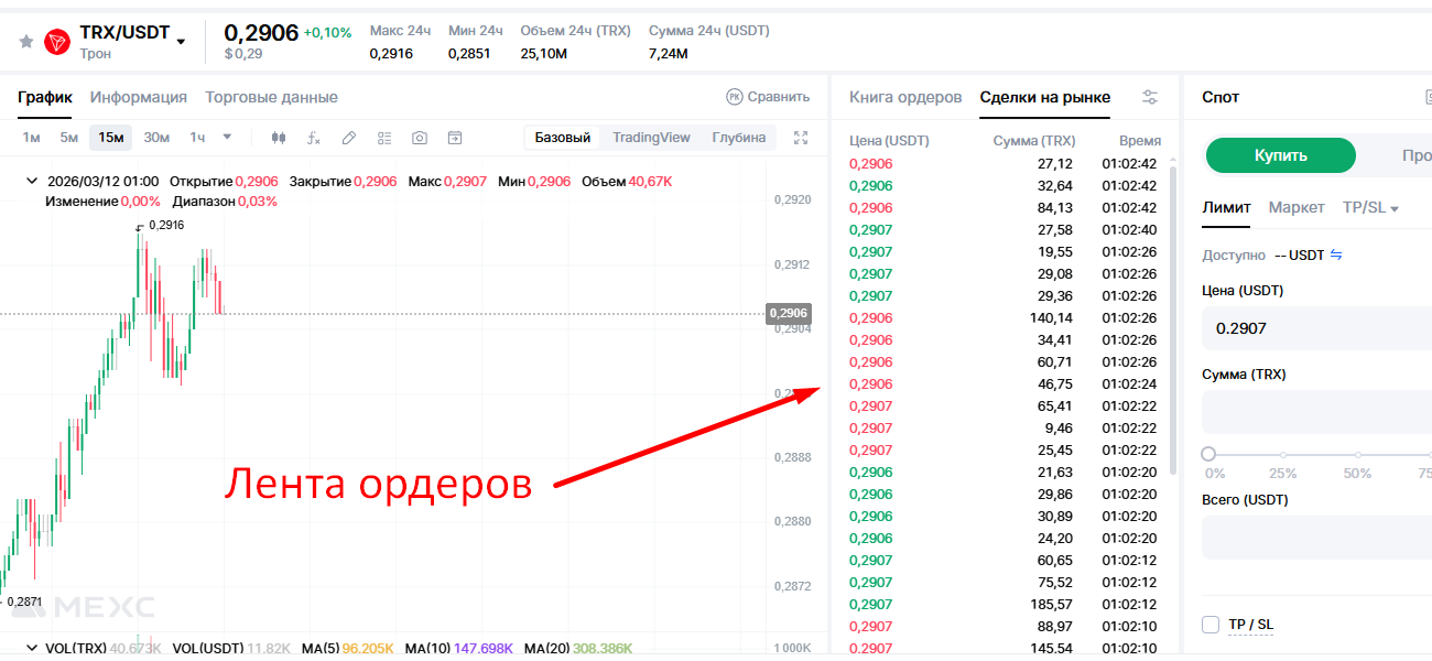 Для более точного понимания рыночной активности стакан ордеров часто анализируется вместе с лентой сделок - потоком уже исполненных транзакций. Такой метод анализа известен как tape reading. Лента сделок показывает реальные операции, которые происходят на рынке, а стакан показывает потенциальные заявки, ожидающие исполнения. Сопоставляя эти два источника информации, трейдер может получить более полное представление о поведении участников рынка.