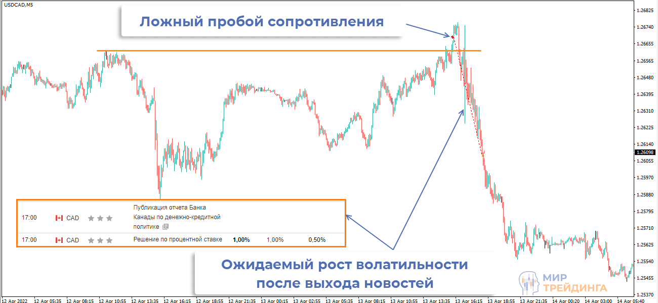 Эта сделка заключалась в прямом эфире. В среду 13 апреля 2022 г. в 17:00 МСК публиковался блок статистики по Канаде, это дало возможность для входа в рынок по паре USDCAD.