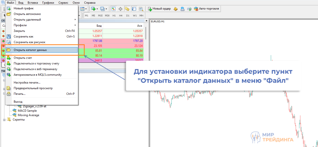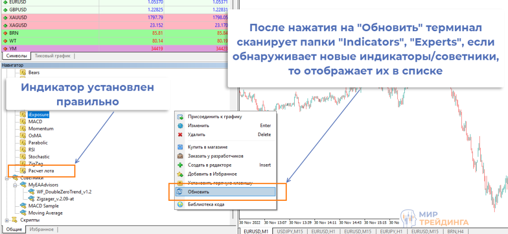 остается сообщить платформе, что индикатор установлен и с ним можно работать. Старые версии МТ4 нужно было перезагружать, но сейчас можно обойтись и без этого. В окне «Навигатор» вызывается контекстное меню, в нем нужно нажать на «Обновить». МТ4 просканирует папки «Indicators» и «Experts», поймет, что добавлен новый индикатор и он станет отображаться в окне «Навигатор».