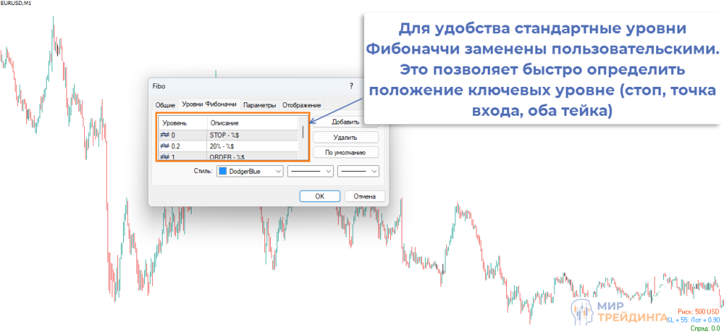используем модифицированные уровни Фибоначчи, чтобы получить точное положение SL, уровня входа в рынок и обоих тейков;