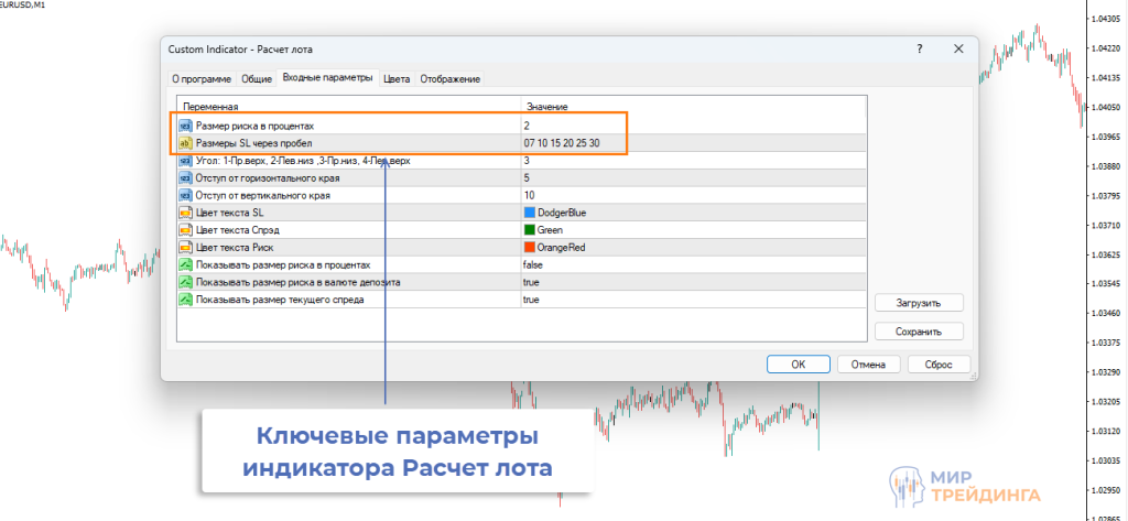 После добавления Расчета лота на график откроется окно с параметрами. Во вкладке «Общие» рекомендую активировать работу с dll файлами. Конкретно этот индикатор с ними не работает, но другие могут использовать их. Проще завести привычку включать этот пункт в настройках сразу.