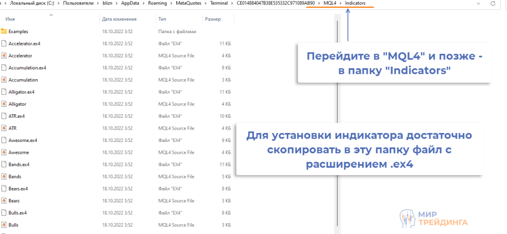 откроется директория, в которой хранятся ресурсы, необходимые для работы терминала. Перейдите в «MQL4» -> «Indicators». Вставьте в эту папку файл индикатора (это файл с расширением .ех4);