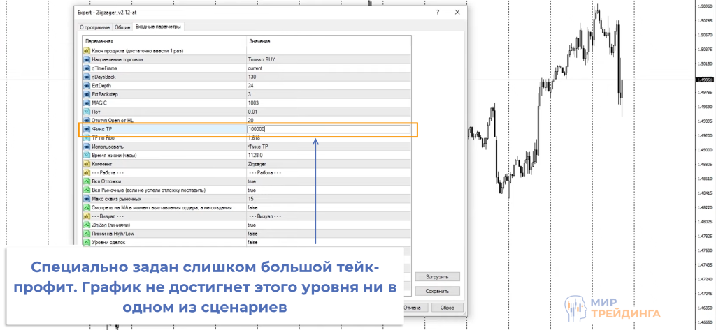 В этом случае позволяем советнику входить в рынок, но решение о закрытии сделок принимает трейдер. Для этого не нужны специальные ограничители. Достаточно задать в настройках советника завышенный тейк-профит. Уровень ТР должен быть таким, чтобы график ни при каком сценарии не достиг его.