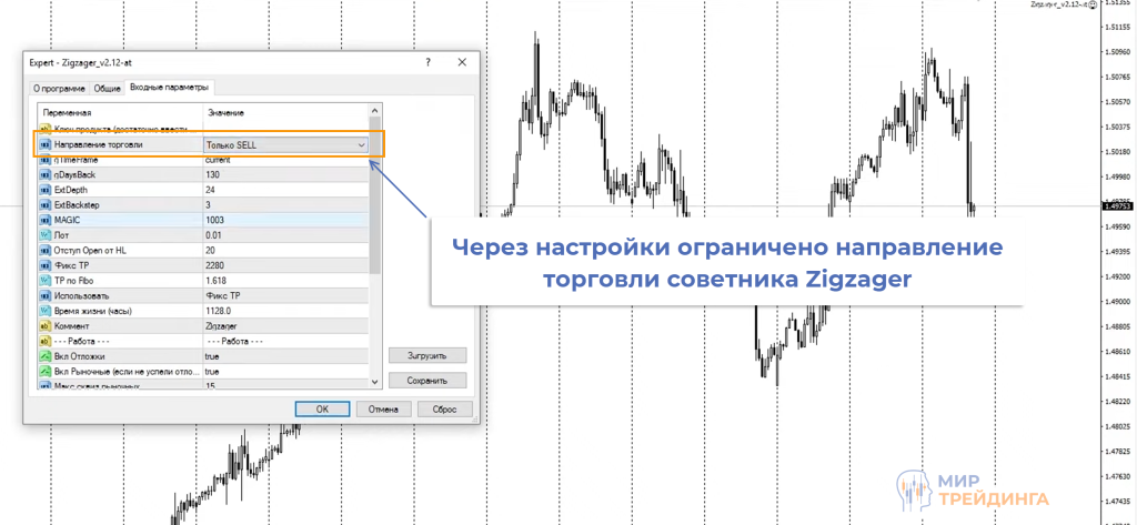 Для примера использован советник Zigzager. В его настройках есть отдельный пункт, отвечающий за направление торговли. Если выбрать вариант «Только Sell», то не будут заключаться сделки на покупку.