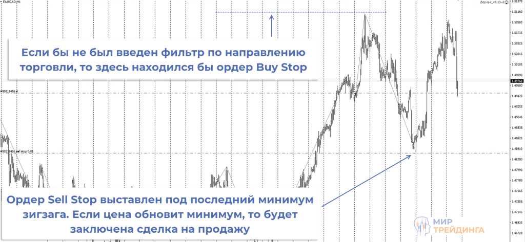 Ограничения по работе видны и на графике. Zigzager работает отложенными ордерами, выставляя их под экстремумы зигзага, этот метод показывает высокую эффективность на трендовых движениях.