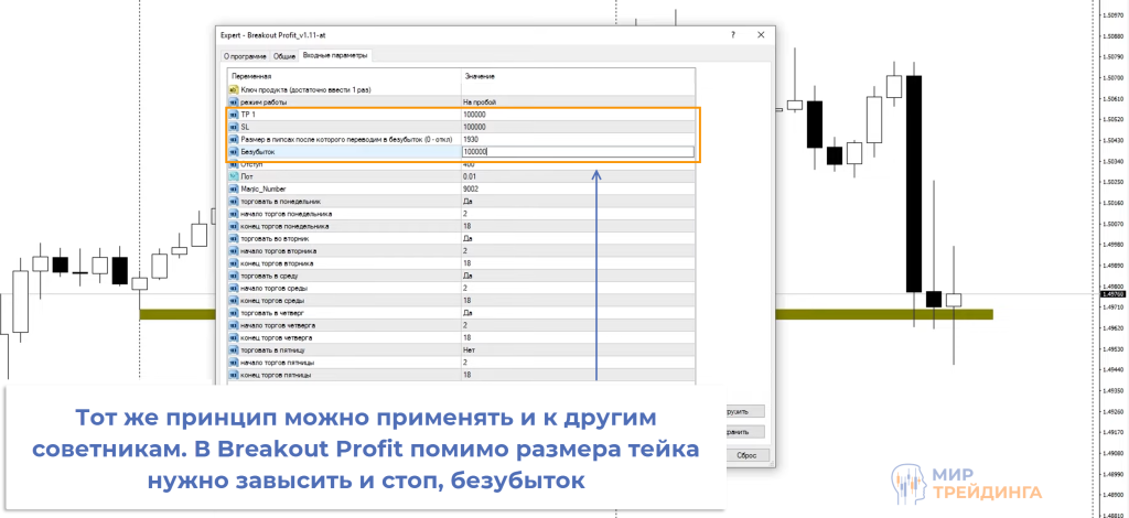 В случае с советником Breakout Profit нужно завысить стоп-лосс и безубыток. При таком сценарии робот превращается в инструмент для открытия сделок, а все остальное должен делать трейдер.