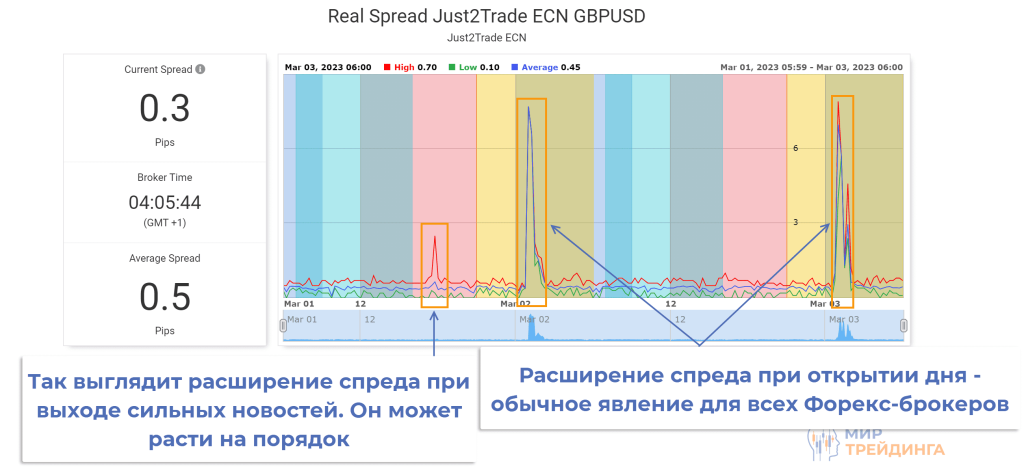 На открытии каждого нового дня происходит расширение спреда – это норма для всех брокеров. Нам нужно оценить, как меняется разница между Бидом и Аском в течение дня. Рекомендую следить за этим параметром при выходе сильных новостей. В отдельные периоды спред может расти на порядок.