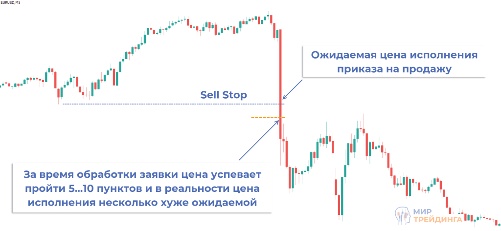 проскальзывание – за время обработки приказа на открытие сделки цена успевает пройти несколько пунктов, и позиция открывается по новой, как правило, менее выгодной цене. Если ТР равен, например, 40 пунктам, а за счет проскальзывания получим цену исполнения хуже на 3-5 пунктов, то это явление «съест» порядка 10% профита;