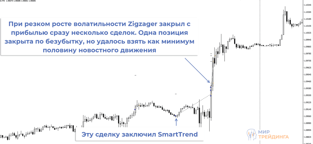 В примере выше Zigzager смог взять часть новостного движения. Сделки заключались при пробое последнего экстремума зигзага.