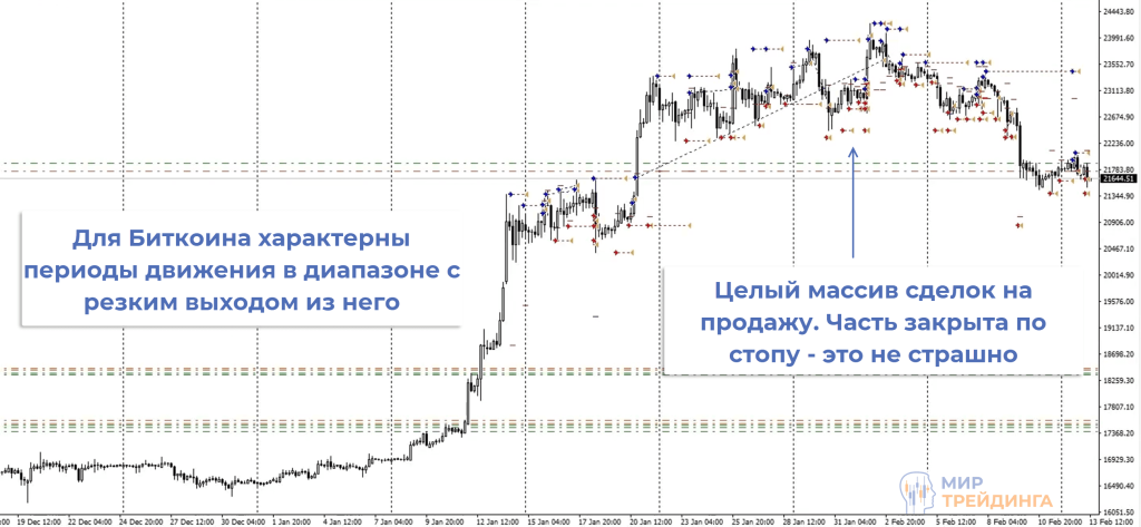 тейк-профит сознательно завышен, его установили на отметке $50000-$60000. ТР задан так, чтобы он гарантированно не сработал случайно, прибыль будем фиксировать вручную. Биткоин часто движется в диапазоне и затем резко выходит из него, пробивая одну из границ.