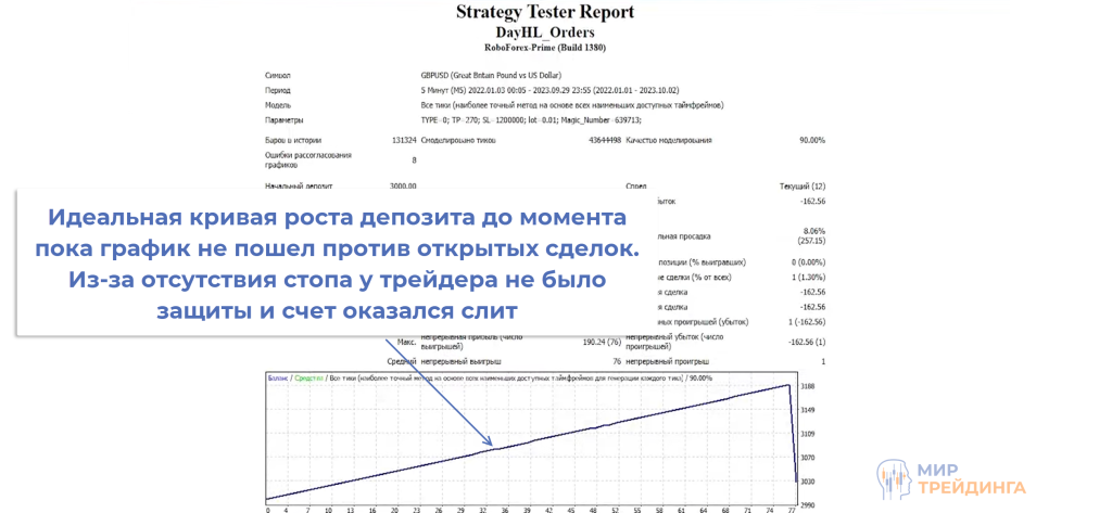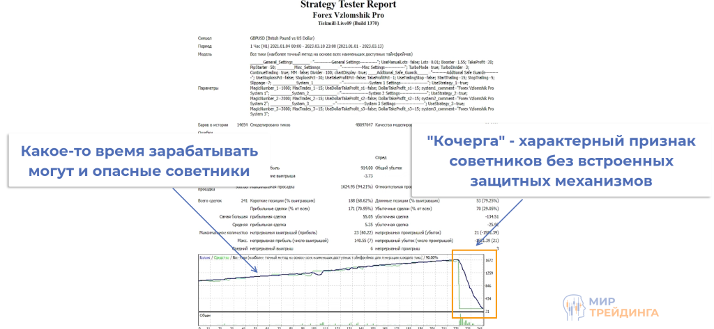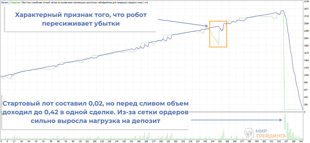 Если у советников нет этой защиты, то он может зарабатывать. Но в какой-то момент времени на кривой роста депозита появляется «кочерга» и баланс обнуляется. Чаще всего это происходит с мартингейловыми сеточниками.