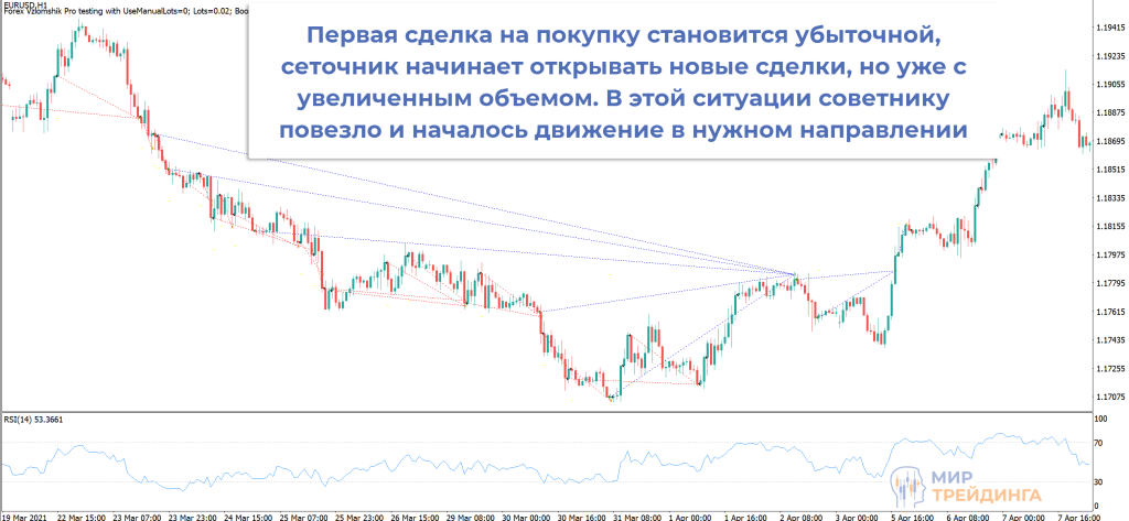 построение сетки при движении графика против первой открытой позиции. Роботы делают это для смещения точки безубытка ближе к текущей рыночной цене. Это позволяет быстро выходить из просадки даже на небольшом движении в нужном направлении. Правда, за возможность быстро компенсировать убыток приходится платить высокой нагрузкой на депозит;
