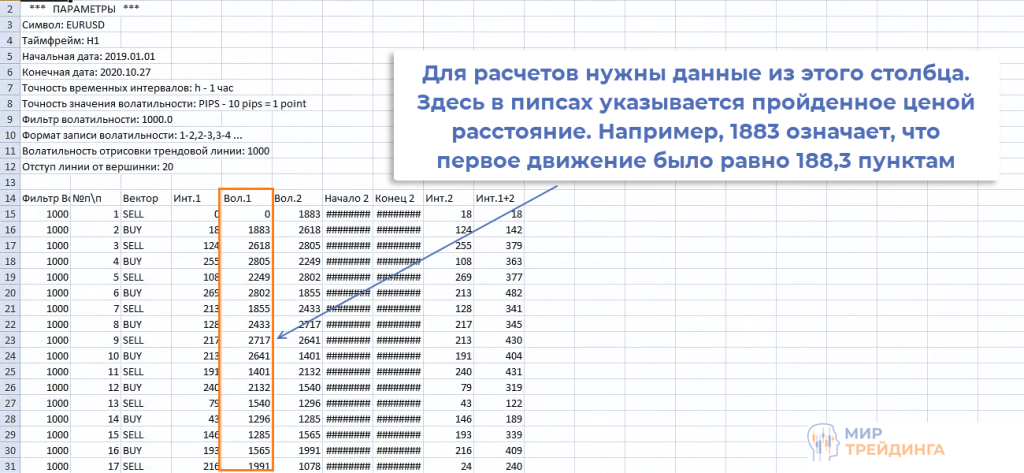 В корневом каталоге в папке files скрипт создает документ Excel и сохраняет в него всю значимую информацию. Нас интересует пройденное ценой расстояние – столбец «Вол.1».