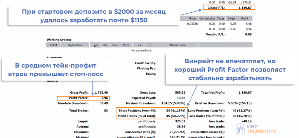 Для демонстрации возможных результатов приведу пару отчетов с реальных счетов. В первом случае за месяц депозит в $2000 вырос на $1150, работа велась только по методу количественного анализа. Обратите внимание на винрейт и Profit Factor, тейк в среднем втрое больше стопа.