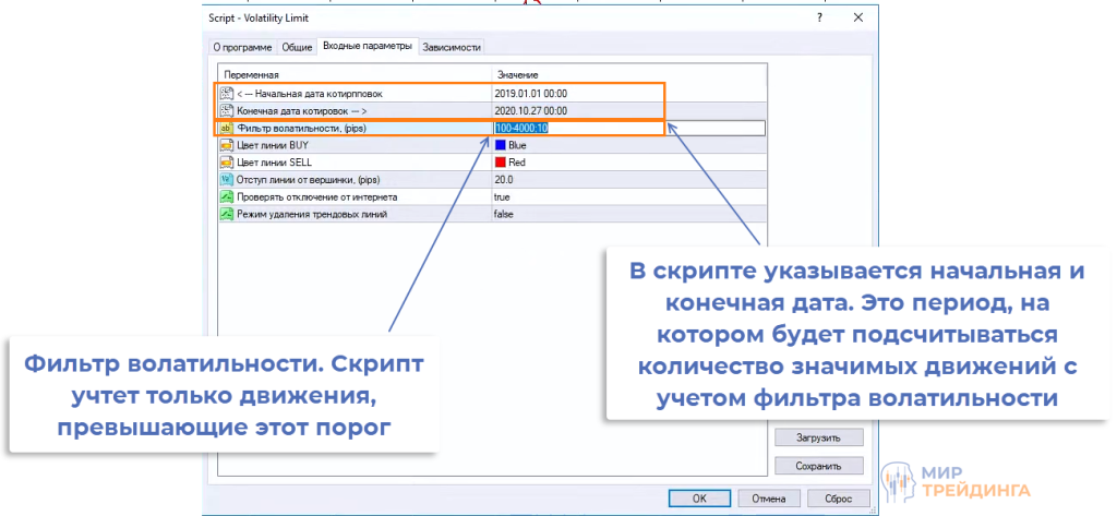 Для сбора статистики используется скрипт, автоматизирующий весь процесс. В нем задается начальная и конечная даты, а также фильтр волатильности, по нему оцениваются все волны на истории.