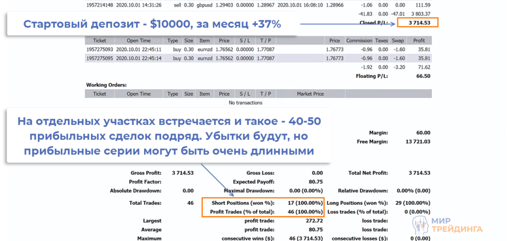 Во втором отчете также доминирует количественный анализ, но были сделки, заключенные по другой методике. Здесь трейдеру и вовсе удалось сделать 46 прибыльных трейдов подряд.