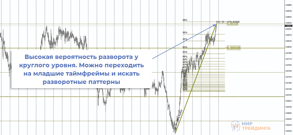 Практика показывает, что лучше всего отрабатывают сценарии, в которых разворот происходит с подтверждением по всем трем фильтрам. Если у круглого уровня наблюдается высокая вероятность разворота, то можно искать паттерны стратегии Снайпер на младших временных интервалах.