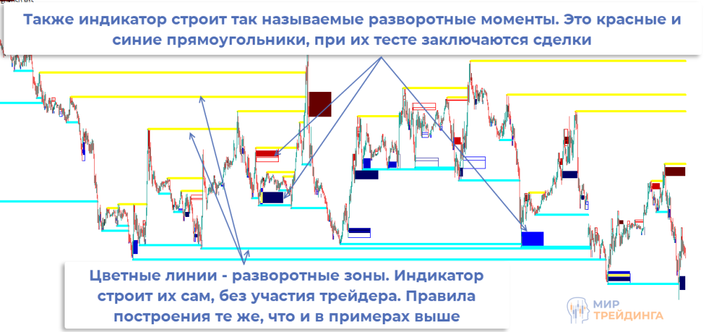 Все построения можно автоматизировать. Мы разработали индикатор, выполняющий всю разметку в автоматическом режиме. Сразу после добавления на график он выделяет массив разворотных зон. Также он строит разворотные моменты, при тесте которых заключаются сделки. Об этих вещах поговорим в одном из следующих материалов.