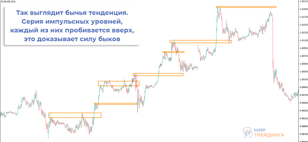 Для формирования тенденции нужно, чтобы было пробито в одном направлении несколько импульсных уровней. При этом рабочие таймфреймы отличаются: