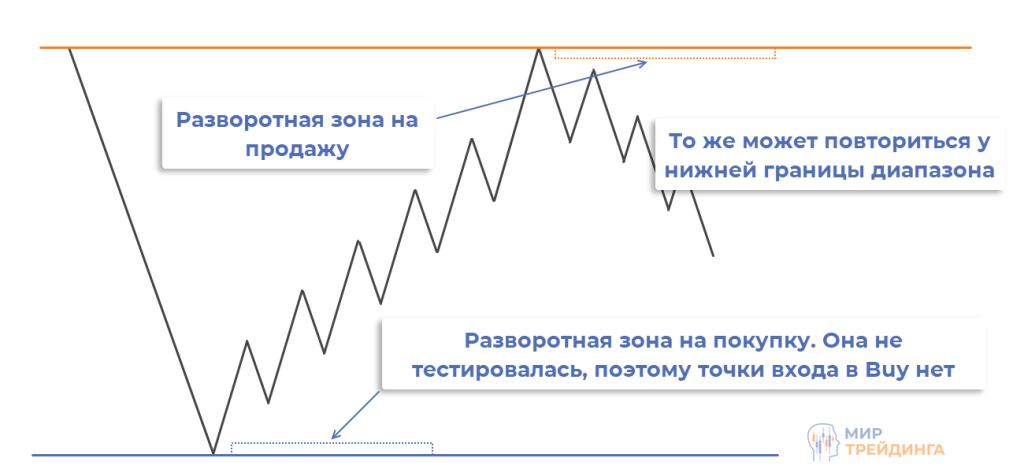 начальное движение не играет роли, нужно лишь чтобы оно было направленным. Затем начинается движение в новом направлении, формируется импульсный уровень, и он пробивается. В момент пробоя можно говорить, что сформировались условия для появления разворотной зоны. Движение скорее всего продлится до противоположной границы диапазона, где может появиться новая РЗ;