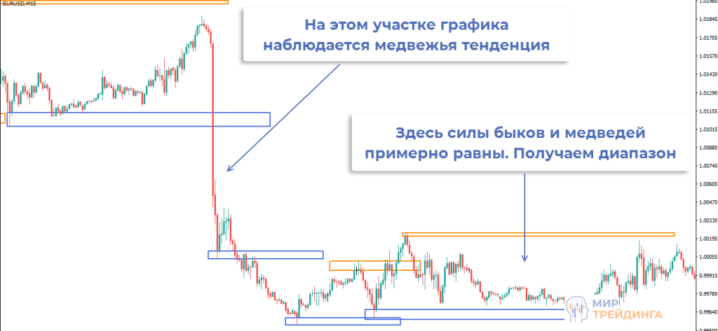 Помимо направленных движений рынок может находиться в равновесном состоянии. Силы быков и покупателей примерно равны, на графике это выглядит как движение в горизонтальном коридоре. В роли верхней и нижней границ выступают уровни.