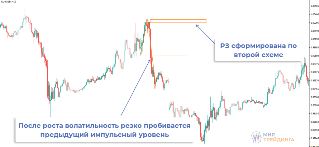 Разворотные зоны, сформированные по второму сценарию, появляются реже, но все же иногда возникают. Обычно это происходит при резком росте волатильности, как в примере ниже.