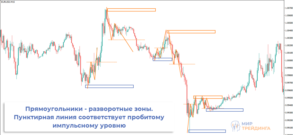 Работа ведется внутри дня, поэтому разметка выполнена на таймфрейме М15. РЗ формируются довольно часто, нужно лишь набить руку в построении импульсных уровней и вовремя идентифицировать их пробои.