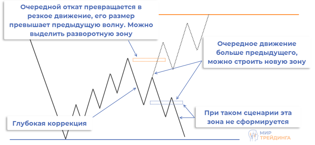вторую схему можно назвать зоной глубокой коррекции. В начальной стадии все происходит так же, как в предыдущем сценарии. В определенный момент времени после очередного импульсного уровня получаем не откат, а резкий рывок. Его размер превышает предыдущее движение. Это и есть глубокая коррекция. По соответствующему экстремуму можно строить разворотную зону. Если следующее движение также окажется резким и превысит предыдущее, то можно выделить еще одну РЗ.