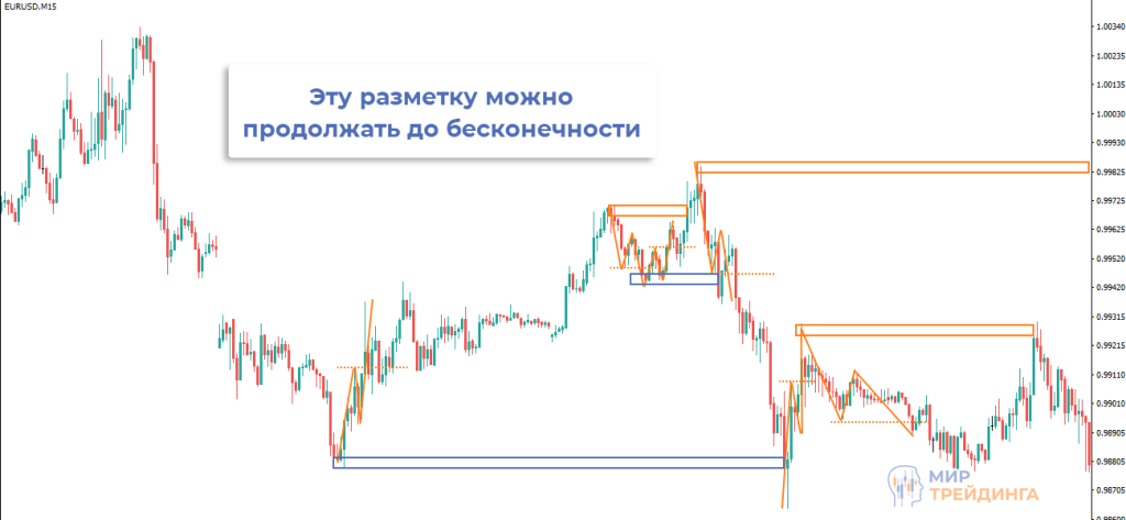 Эту разметку можно продолжать. На любом торговом инструменте логика одна и та же. Практически постоянно получаем целый набор разворотных зон на покупку и продажу.