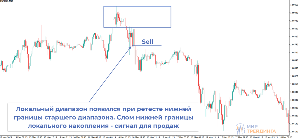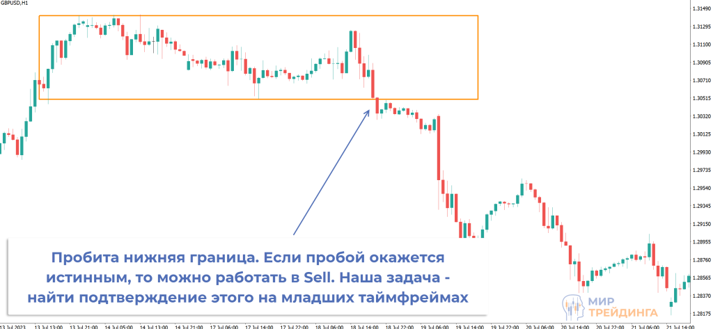 Используется тот же подход, что и на старших временных интервалах – нужен либо слом локального диапазона, либо соответствующая реакция на импульсный уровень. Это позволяет определять момент закрепления под уровнем, если пробой окажется истинным.