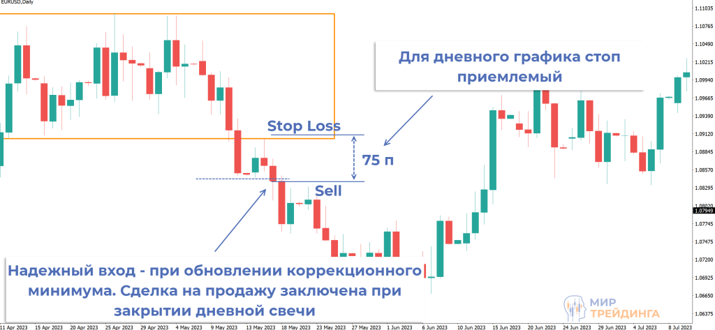 В первом сценарии трейдер работал только на дневном временном интервале. Использовался консервативный вход – продажи при обновлении пробойного минимума. Трейдер дождался закрытия дневной свечи, вынес защитный ордер за коррекционный High и получил стоп в размере 75 пунктов.