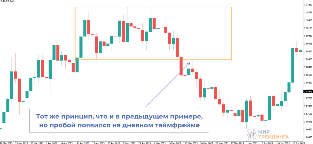 локальный диапазон и слом его нижней границы. Это простой, но сильный фильтр. После закрепления под его нижней границей можно продавать. Учитывая, что изначально пробой определяли на дневном графике, цели также можно определять по старшему таймфрейму.
