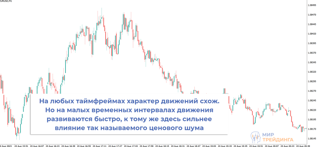 характер движения графика. На малых таймфреймах торговать сложнее. Здесь выше психологическая нагрузка, нужно быстро реагировать, сильнее влияние ценового шума (случайное движение котировок).