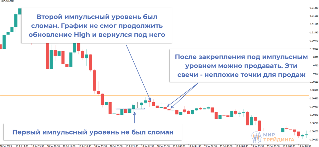 Пример показывает, что в рамках коррекции к пробитой поддержке появилось 2 импульсных уровня. Второй был сломан. Это означает, что после его формирования пара не смогла обновить максимум. После возврата под уровень и закрепления ниже поддержки можно было продавать.