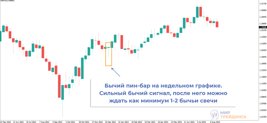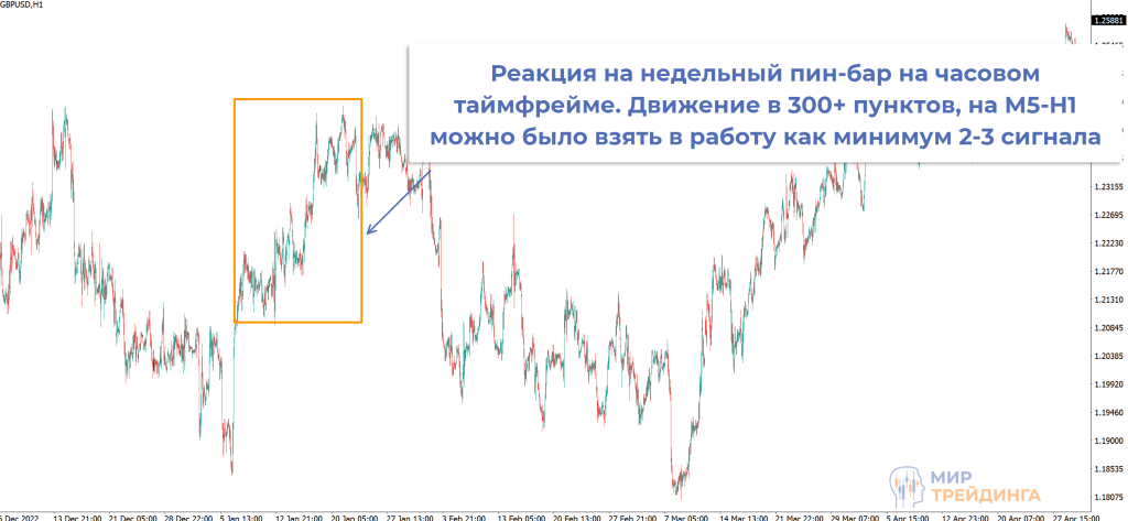 Пин-бар, например, на М1-М5 – очень слабый сигнал. Рынок может проигнорировать его, отработка может оказаться в районе нескольких пунктов. Но тот же пин-бар на дневном или недельном таймфрейме превращается в сильнейший разворотный сигнал даже при условии, что нет опоры на уровень. Вероятнее всего будет реакция как минимум в течение следующих 1-2 свечей. На внутридневных таймфреймах это даст неплохие движения.
