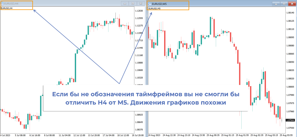 Если бы в окне терминала не отображался таймфрейм, то было бы невозможно отличить, например, М5 от Н4. Несмотря на различие с точки зрения временного фактора, характер движения цены примерно совпадает. Встречаются импульсы, флетовые периоды, отрабатывают графические и свечные паттерны.