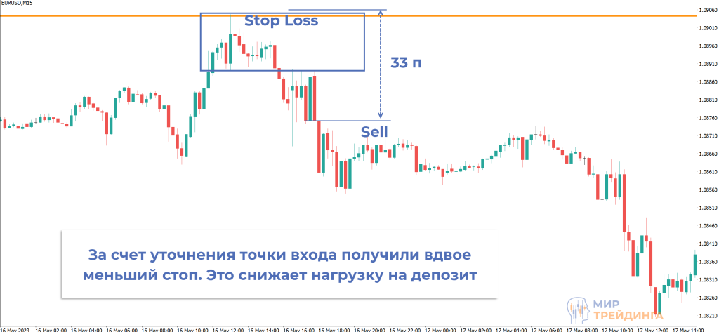 Во втором сценарии вход уточнялся на М15, и торговля ведется после слома локального накопления. За счет перехода на внутридневный временной интервал стоп снижается более чем в 2 раза. SL составил 33 пункта вместо 75.