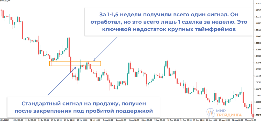 Это компромисс. С одной стороны, на этом временном интервале слабо сказывается ценовой шум. С другой – остается время на принятие решения. Верхняя планка – Н1, часовые свечи будут комфортными с точки зрения частоты торговли, но уже на Н4 почувствуете резкое снижение частоты торговли.