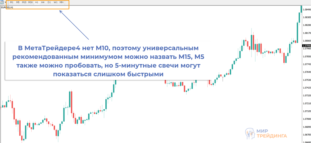 Если говорить о том, какой минимальный таймфрейм рекомендован начинающему трейдеру, то универсальным минимумом я бы назвал М10-М15. В МетаТрейдере4 нет стандартного временного интервала М10, если торгуете в МТ4, то универсальный минимум – М15. На этих таймфреймах определяются и блоки ордеров (скопления стопов, отложенных ордеров).