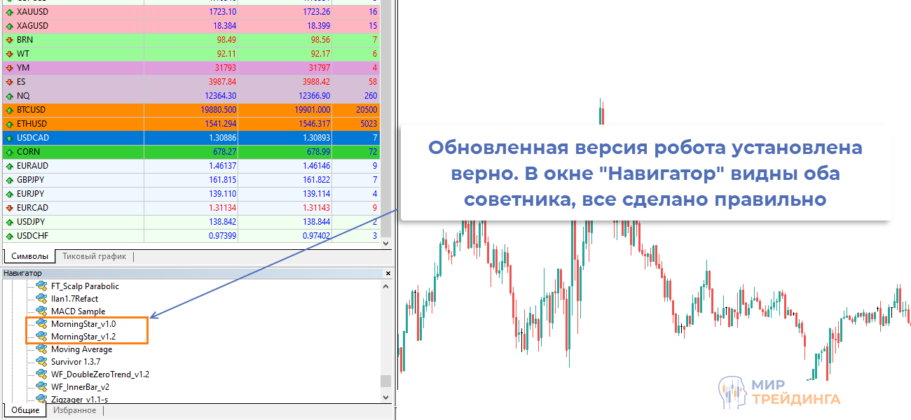 терминал можно либо перезапустить, либо обновить список доступных роботов в окне «Навигатор». Для этого вызовите контекстное меню и выберите пункт «Обновить». В результате в окне «Навигатор» должны отображаться обе версии алгоритмов. В примере устанавливался обновленный вариант MorningStar. Все сделано правильно;