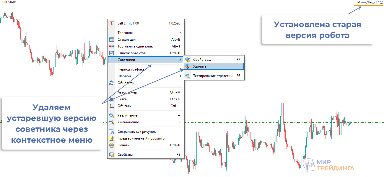 старая версия удаляется с графика. На соответствующем графике вызывается контекстное меню, в нем выбирается пункт «Советники» > «Удалить»;