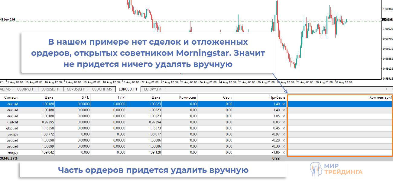 нужно оценить открытые ордера. Если среди них есть сделки, открытые советником, то их нужно удалить вручную. Отложенные приказы также отменяются. Неизвестно, есть ли в обновленном алгоритме поддержка оставшихся ордеров. Если нет, то он не подхватит их после запуска. Они будут существовать сами по себе. Ордера идентифицируются по magic number и комментариям. Обычно в комментарии указывается название советника. В нашем примере таких позиций нет, поэтому ничего удалять не пришлось;