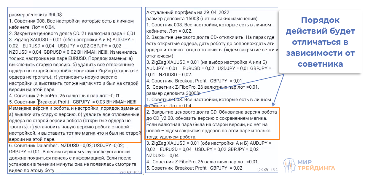 Любой адекватный разработчик всегда дает подробную инструкцию для своих продуктов. Мы не исключение. Поэтому при выходе каждого обновления советника в Telegram выкладывается подробный алгоритм действий. Он будет отличаться в зависимости от конкретного робота.