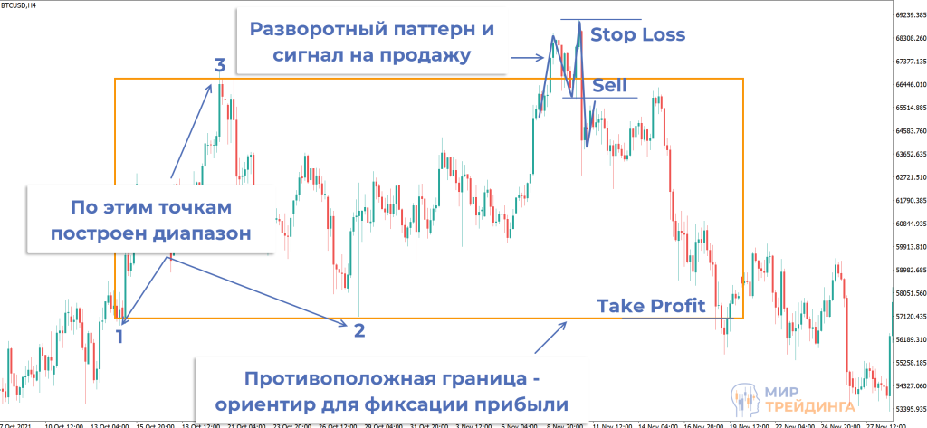 у одной из границ возникает разворотный сигнал. В идеале это ложный пробой, происходит заброс графика за уровень, быстрый возврат в диапазон и закрепление за ложно пробитым уровнем;