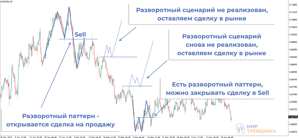 оптимальный сценарий – следить за поведением графика при подходе к очередному уровню. Если увидите разворотный паттерн, то можете закрывать весь объем, допускается переворот, то есть открытие встречной позиции.