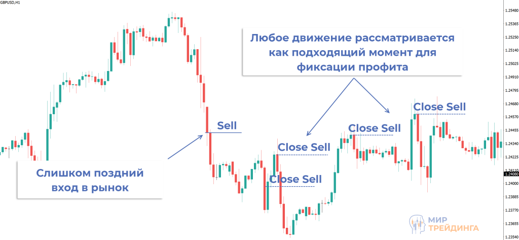 Если трейдер входит в рынок с опозданием, то правильно закрывать позицию еще сложнее. Risk Reward не в его пользу, даже если график идет в нужном направлении любое движение против открытой сделки может спровоцировать его закрыть позицию.